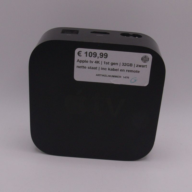 Apple TV 4K 1st generation 32GB in B‑grade (goed gebruikt) — volledig werkend en ideaal voor het streamen van je favoriete films en series in 4K HDR. De set wordt geleverd inclusief stroomkabel, HDMI‑kabel en Siri Remote, dus direct klaar voor gebruik. De mediaspeler ondersteunt Apple‑diensten zoals Apple TV+, AirPlay en meer. 1 maand garantie inbegrepen — duurzaam hergebruik voor je home‑entertainment!