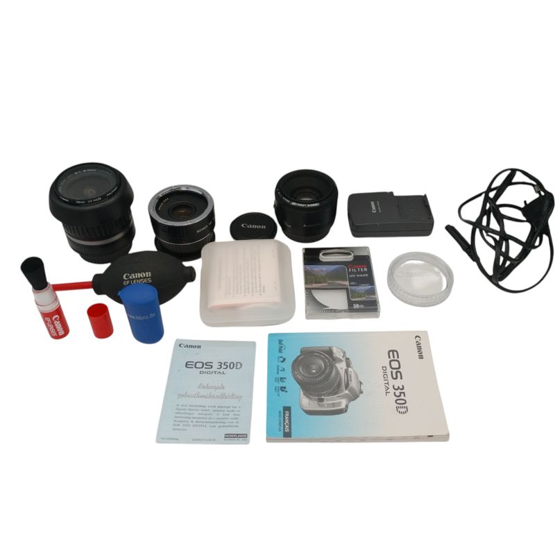 Deze zeer complete set wordt geleverd met drie originele Canon-lenzen, een Canon teleconverter én een zo goed als nieuwe Canon cameratas, zodat je direct alles bij de hand hebt om te fotograferen én veilig te vervoeren.