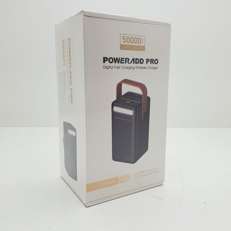 Krachtige POWERΛDD PRO Powerbank met maar liefst 50.000mAh capaciteit en 65W Power Delivery (PD) via USB-C. Perfect voor het opladen van laptops, MacBooks, smartphones en tablets – waar je ook bent! Ideaal voor onderweg, kamperen of op reis.