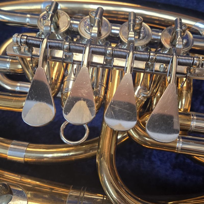 Deze tenor noorn is jarenlang gebruikt in een blaasorkest dat nu met pensioen is. Hij heeft uiteraard gebruikerssporen, maar geen noemenswaardige beschadigingen of deuken.