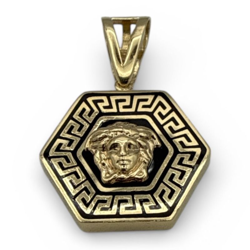Deze 14 karaat gouden hanger in Versace-stijl is een stijlvol en opvallend sieraad met een luxe uitstraling.