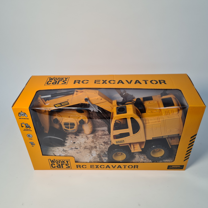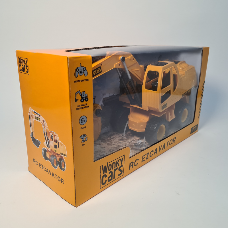 De Wonky Cars Excavator is een 1:24 uitvoering van een echte graafmachine. Het op afstand bestuurbare voertuig kan rijden, scheppen en kiepen. Door de grote schepbak aan de voorkant is het mogelijk om bijvoorbeeld zand te verplaatsen.